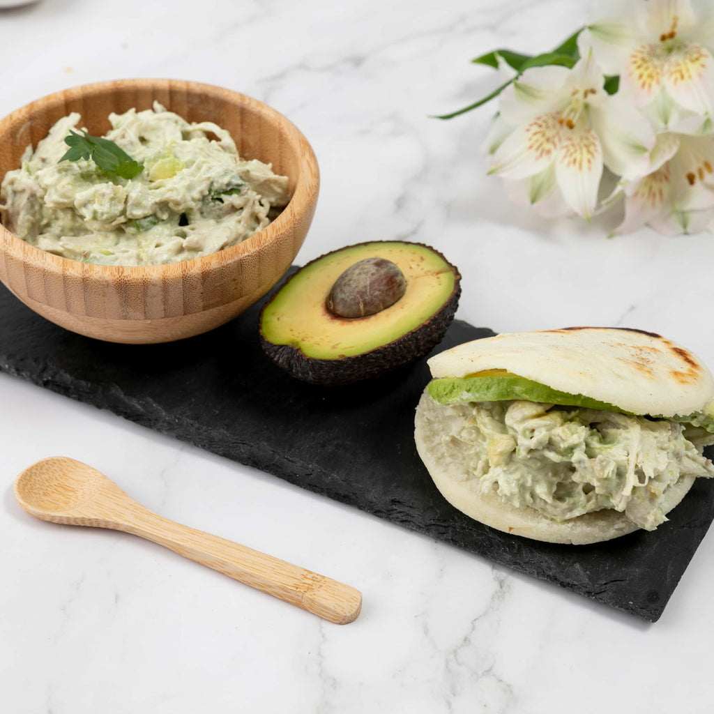 Ingredientes: Tiras de pechuga de pollo mechado, aguacate, alioli, guacamole, yogurt griego natural, ajo, sal y pimienta.